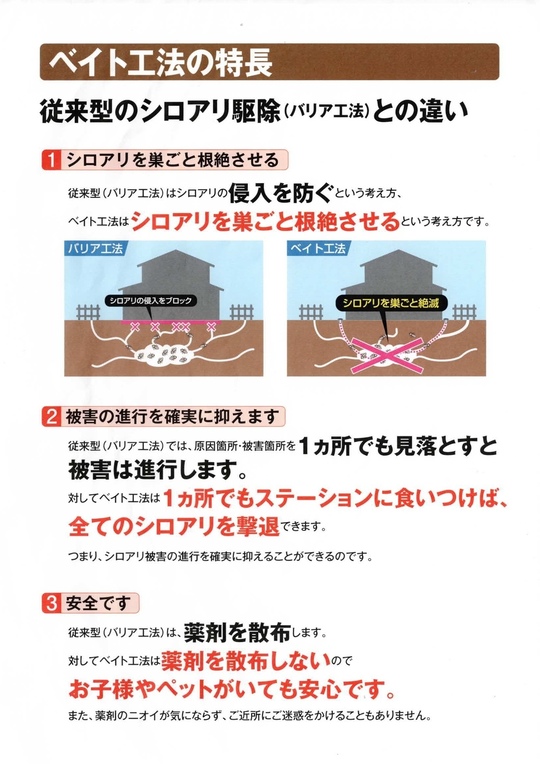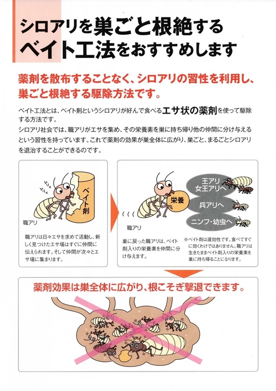 ベイト工法とはベイト剤というシロアリが好んで食べるエサ場の薬剤を使って駆除する方法です。シロアリ社会では、職アリがエサを集め、その栄養素を巣に持ち帰り他の仲間に分け与えるという修正を持っています。これで薬剤の効果が巣全体に広がり、巣ごと、まるごとシロアリを退治することができるのです。
