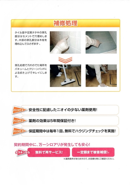 現在土壌に、シロアリの存在は確認されていません。しかし、シロアリは春から夏にかけて飛来し、お宅の土壌に迫ってくる可能性があります。シロアリ予防のために、家屋を薬剤でブロックすることをおすすめします。安全性に配慮したニオイの少ない薬剤を床下へ直接散布します。